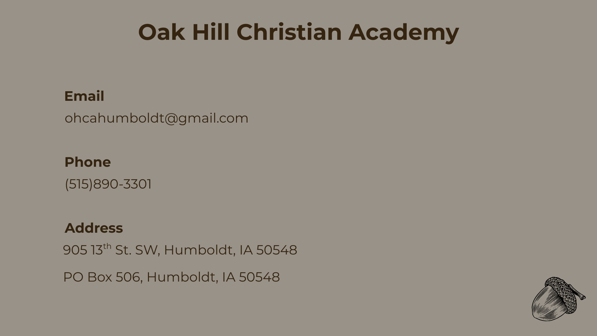 Oak Hill Christian Academy will serve students and families in Humboldt and the surrounding ares in PreK - 5th grade.